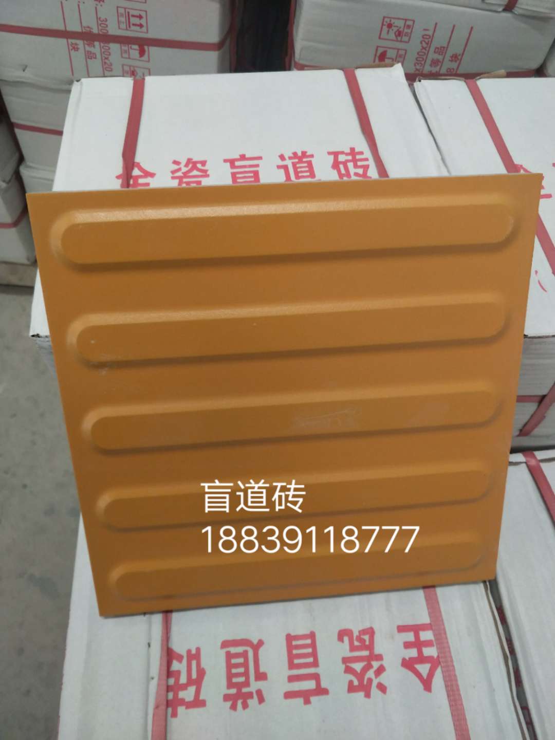 二、陶瓷止步盲道磚,300*300*25(帶防滑點),【全瓷盲道磚特點】:.色彩鮮亮:高溫?zé)Y(jié)、自然成色、故其色彩更顯純凈天然、高雅華貴。.美觀大方:簡潔大方、觸覺明顯、磚體表面如玉、不褪色。.抗風(fēng)化:工藝配方獨特,內(nèi)外品質(zhì)一致,久經(jīng)風(fēng)吹雨曬,雨雪露凍,而光彩依然。.抗折抗壓:產(chǎn)品厚度達到20mm-25mm??拐蹚姸?、抗壓強度均大于花崗巖。.耐磨性:高壓成型、吸水率小、體質(zhì)密度大、耐磨耐用。