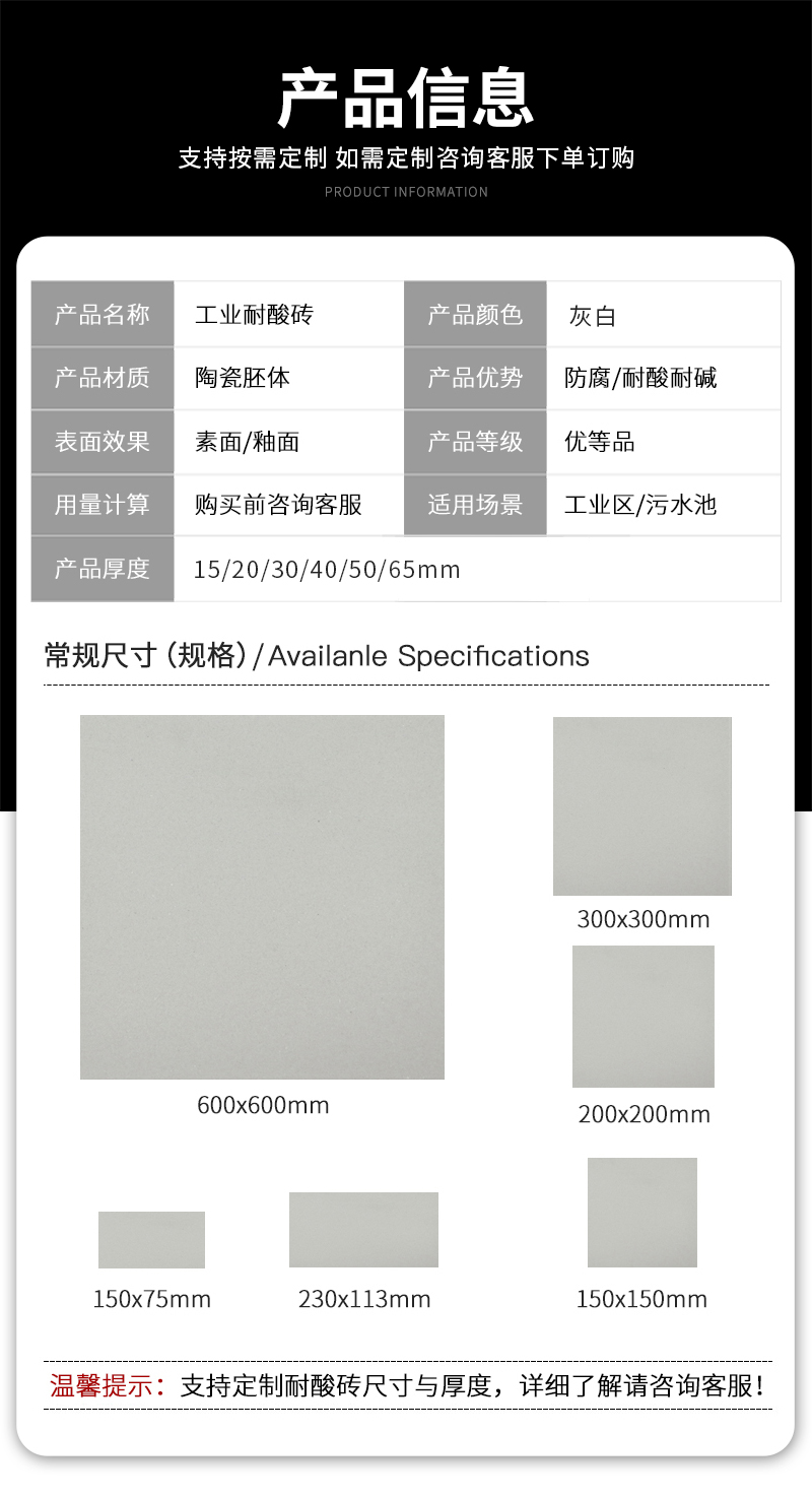 40厚耐酸磚目前只有一種230*113*40,耐酸磚價(jià)格在160元一平方, 耐酸磚厚度大小不一樣,價(jià)格錯(cuò)的也挺多的,比如150*150*15mm,200*200*15mm,300*300*15mm的價(jià)格是比較便宜的(45-50元) ,上圖